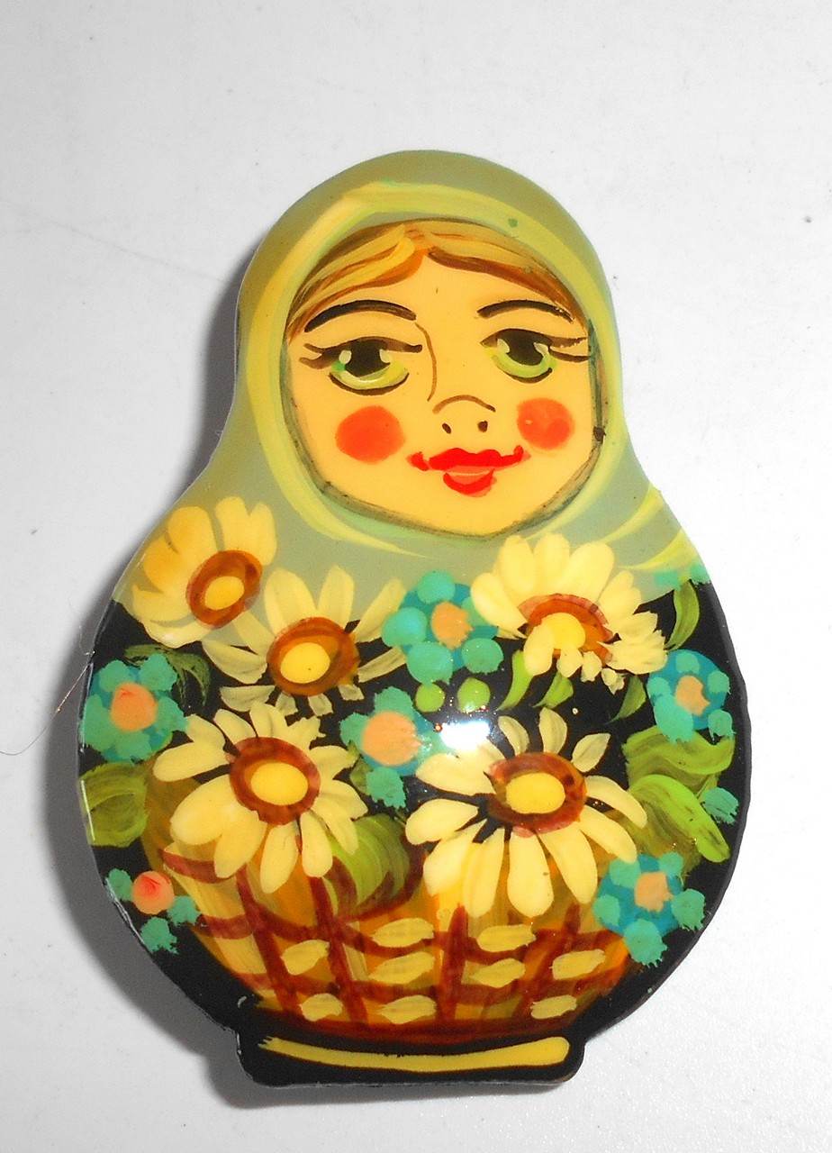 Brooch: Anya with flower basket pale green scarf Babushka Matryoshka Babooshki Babushkas