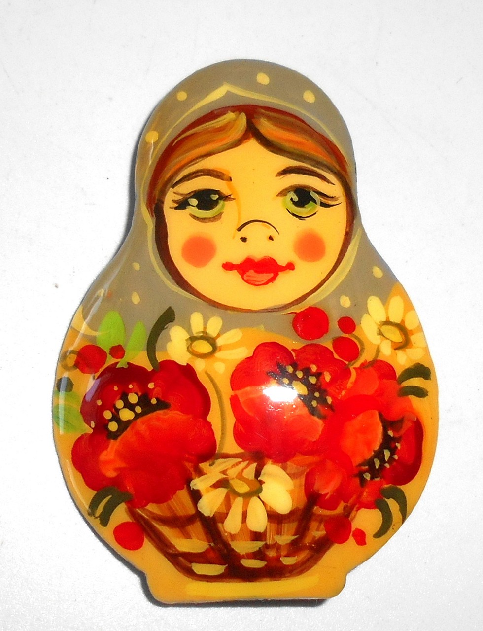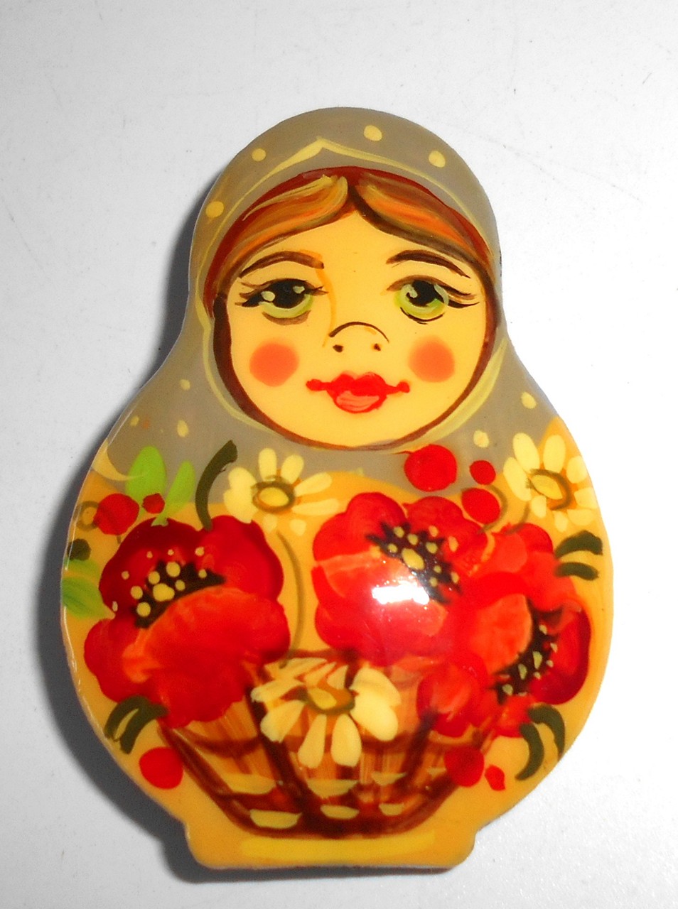 Brooch: Anya with poppies light brown scarf Babushka Matryoshka Babooshki Babushkas