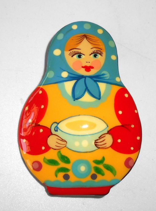 Brooch: Galya with tea cup blue scarf Babushka Matryoshka Babooshki Babushkas