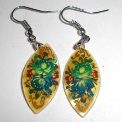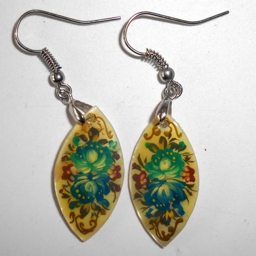 Each pair has been hand-painted by an artist. These earrings are made of mother of pearl, and the paint protected by lacquer, Simple metal hooks complete this pair of fun earrings. These earrings would be a great addition to anyone’s jewelry collection! It would also be a great gift for anyone who just loves different jewelry.