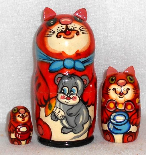 Funny ginger cat with mouse & mushroom 3-set small Babushka Matryoshka nesting Doll Babooshki Babushkas
