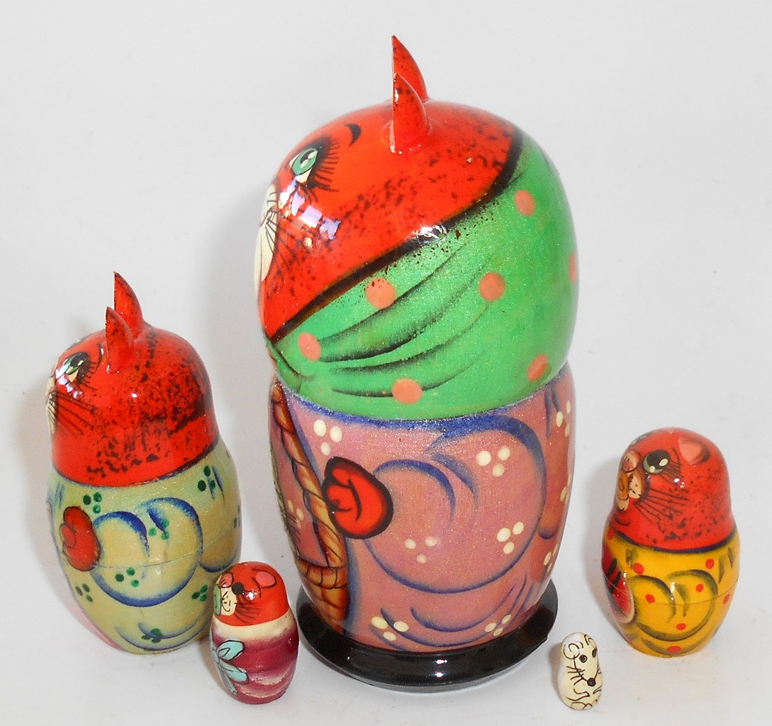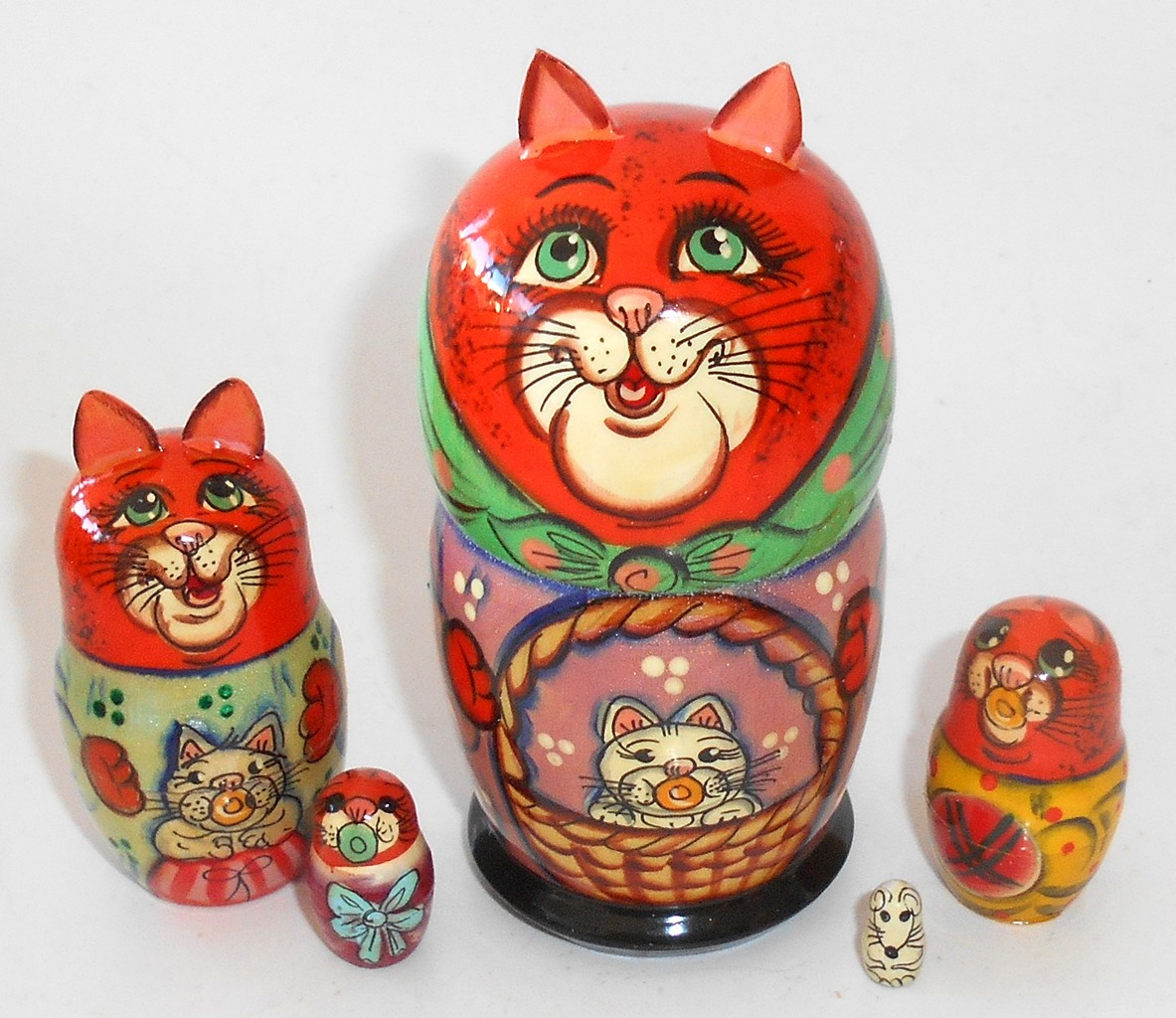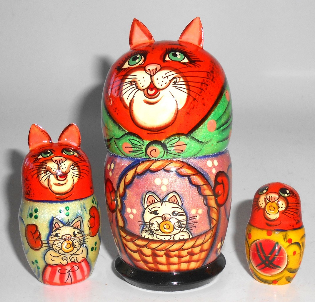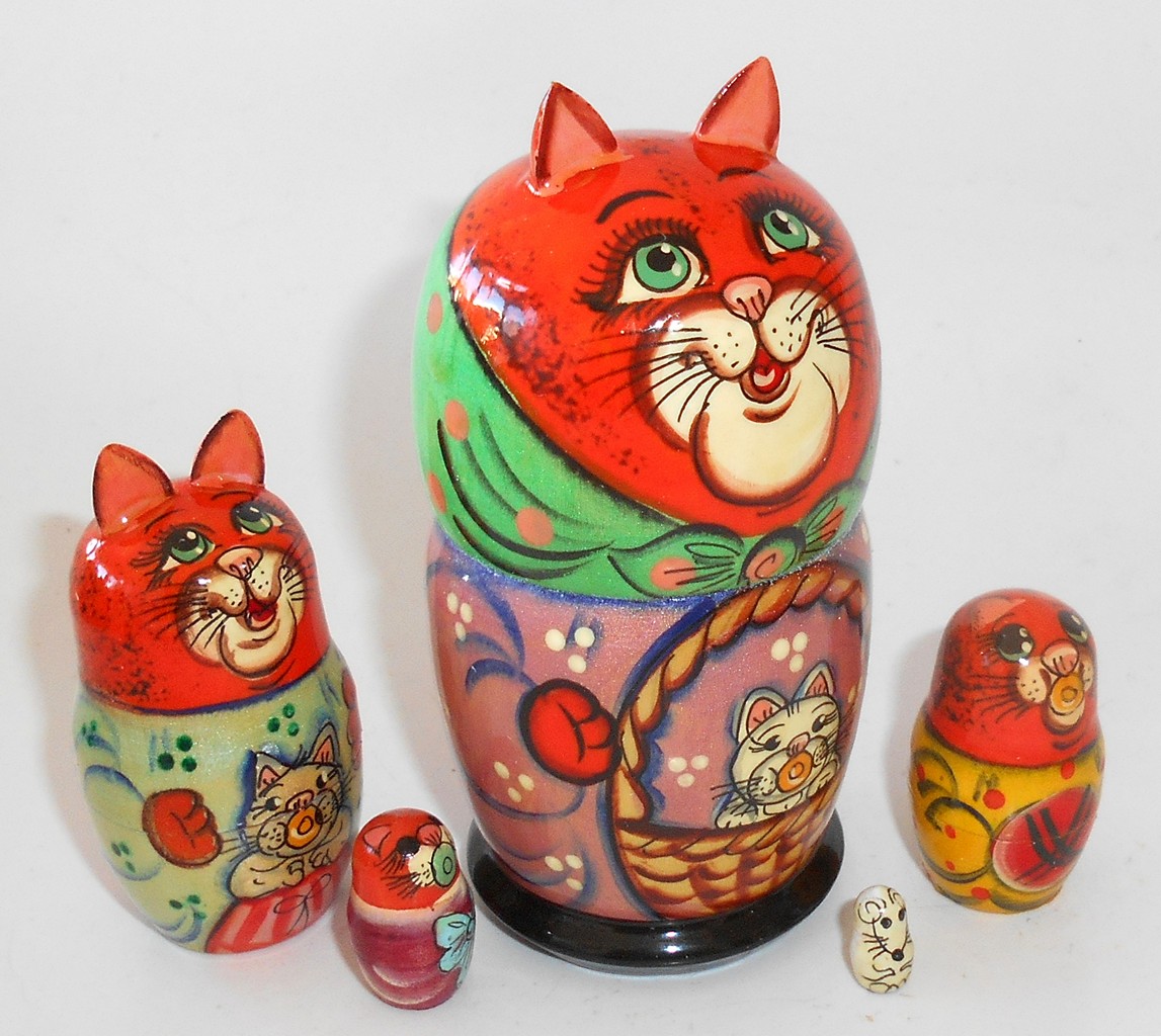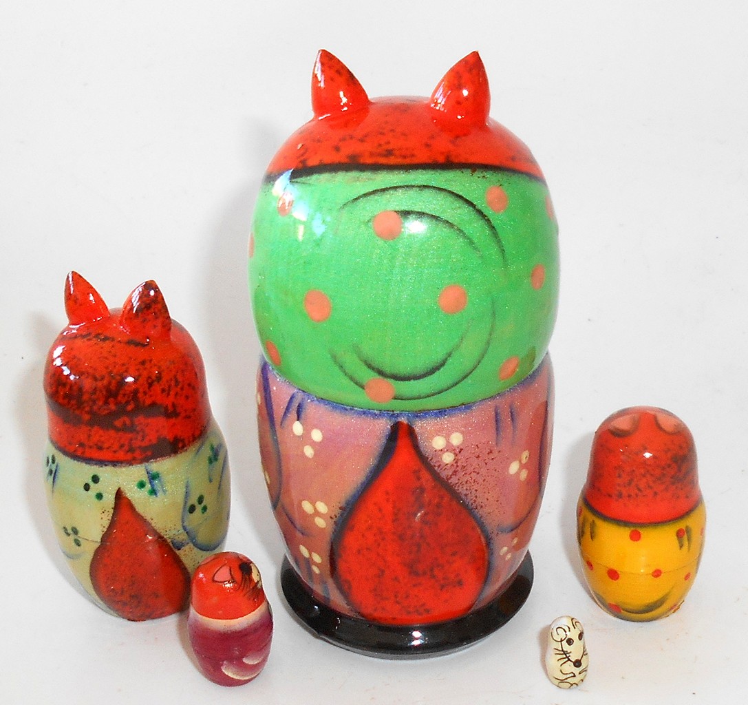 Funny red Cat green scarf with kitten small Babushka Matryoshka nesting Doll Babooshki Babushkas
