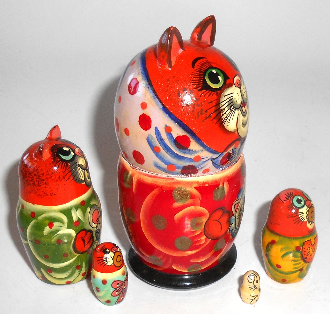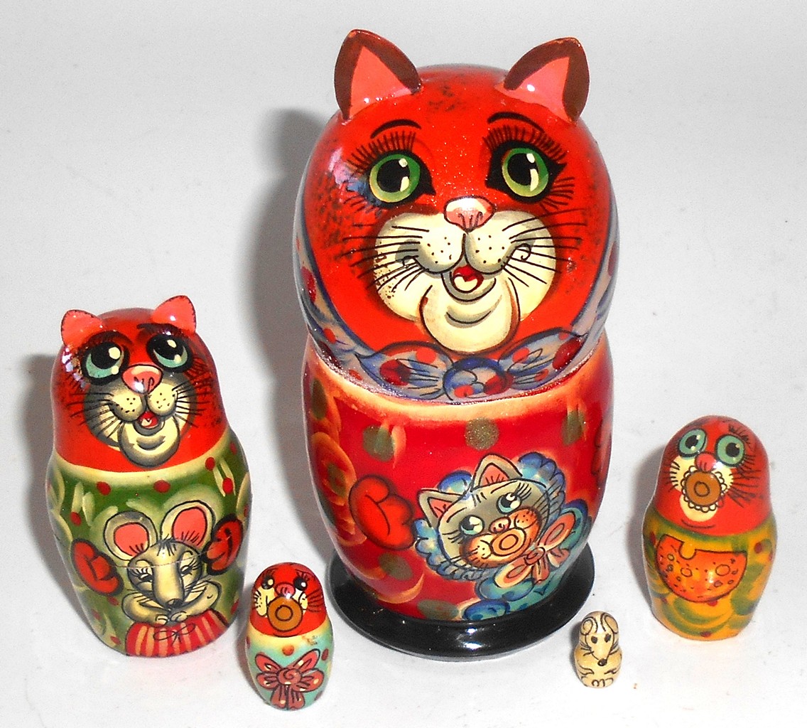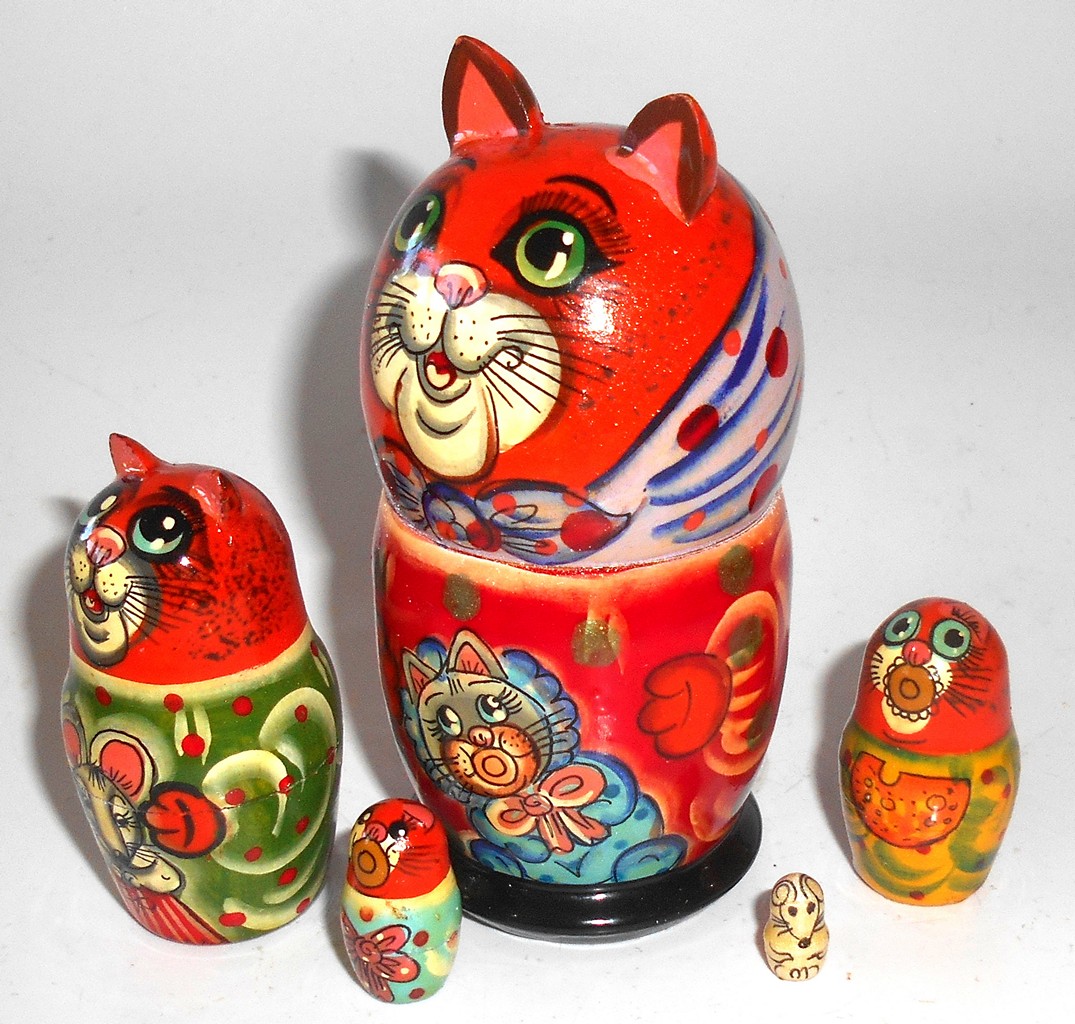 Funny red Cat in scarf with kitten small Babushka Matryoshka nesting Doll Babooshki Babushkas