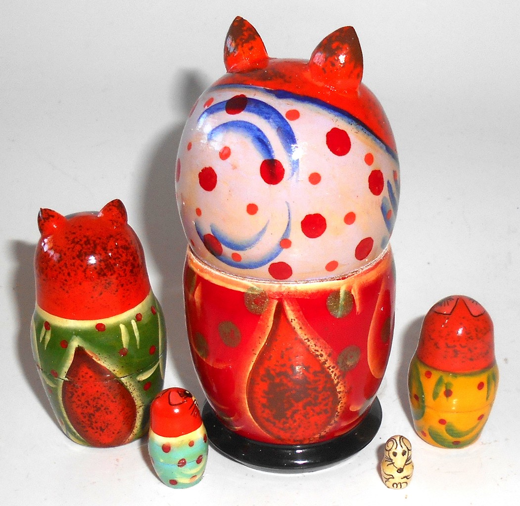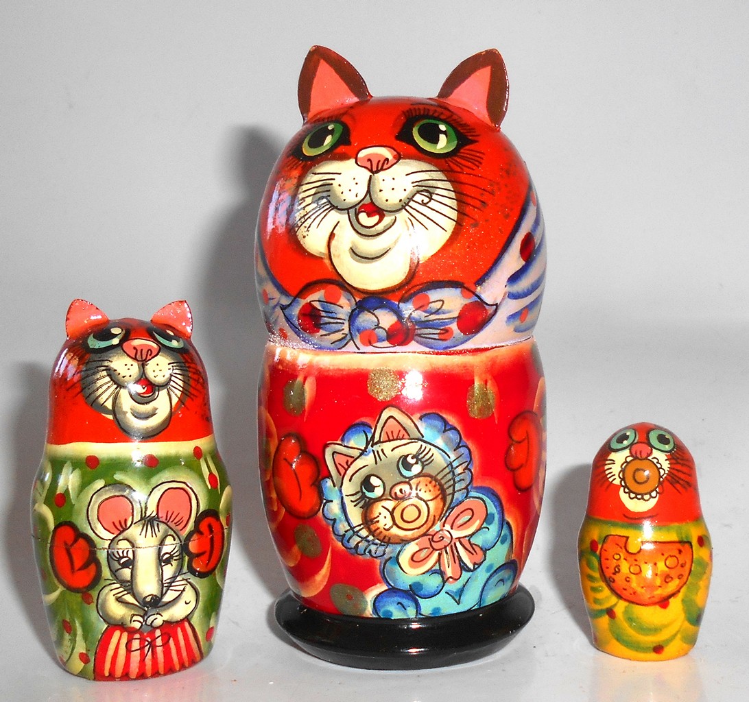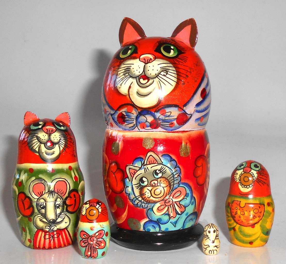 Funny red Cat in scarf with kitten small Babushka Matryoshka nesting Doll Babooshki Babushkas