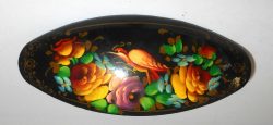 Hair Clip: Flowers on black w/bird oval Babushka Matryoshka Babooshki Babushkas