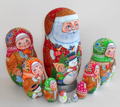 Huge Santa with Snowman & two girls 10-set Babushka Matryoshka nesting Doll Babooshki Babushkas