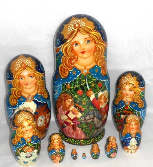 This item presents Nutcracker fairy tale. The artist used soft colours of aquarelle (water-colour paint). Dolls are painted all around with beautiful multi-figure scenes.