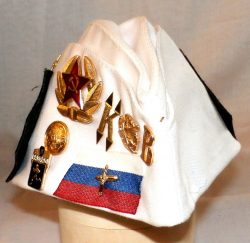 This Soviet forage cap – pilotka comes with lots of authentic Soviet insignia: 14-15 pins and badges and two metal military buttons attached on one side of a hat. One genuine Soviet Army shoulder board is sewn on the other side.